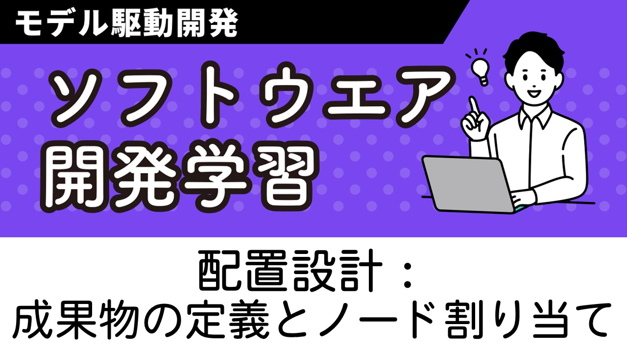 コンポーネントをノードに割り当てる具体的な3ステップを解説します。同一プロセスのコンポーネントをまとめてソフトウェア成果物を定義し、サーバやECUなどのノードへ割り当てます。ライフサイクルの違いによる成果物の分け方も学べます。